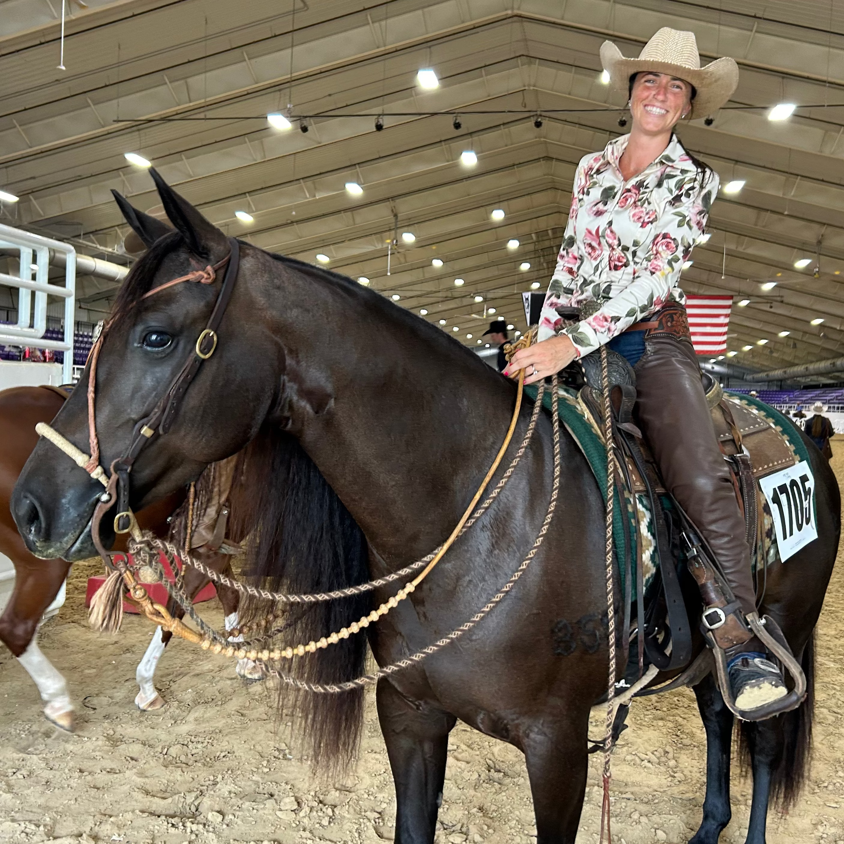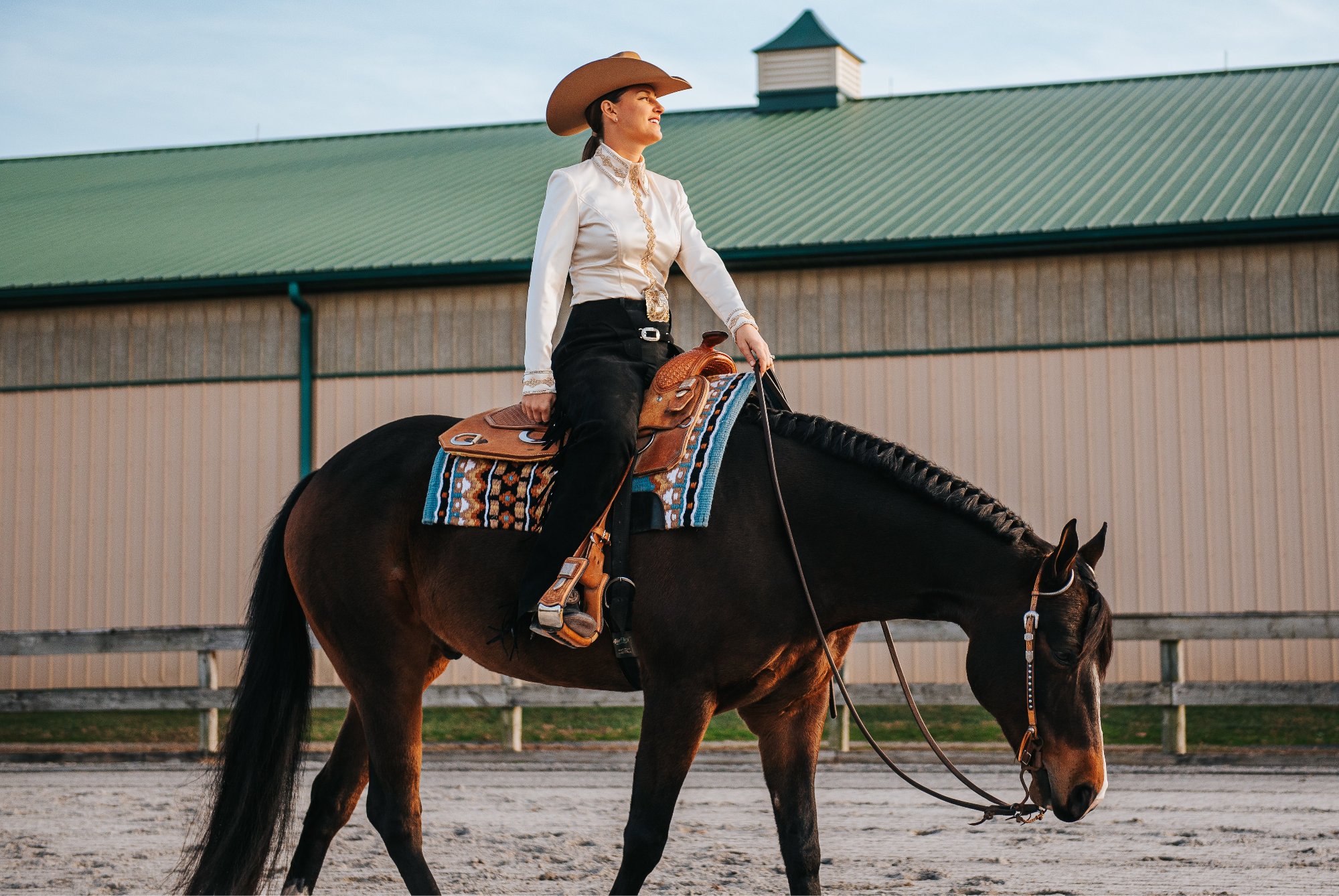 It’s that attitude and grit that helped make her a World Champion in the ARHA Amateur Working Ranch Horse class two years ago, while she was pregnant with their first child. Throughout her lifetime, she has shown western pleasure, ranch, and reining horses, appreciating the skills of the horse and honing the skills to ride each individual horse well.